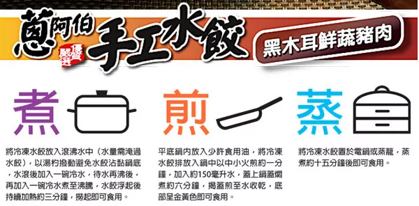 煮:水煮開後放入水餃,再次沸騰時加入半碗冷水,為使水餃更加Q時,可再重複沸騰加水,待第三次滾時撈起,即可食用。